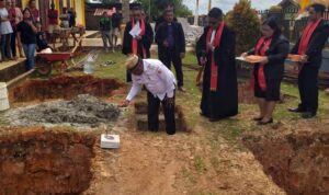 kabardigoel.com: Bupati Kabupaten Boven Digoel, Hengky Yaluwo, laksanakan peletakan batu pertama pembangunan menara lonceng gereja Ora Et Labora Asiki, Kamis ( 19/9/2024 )