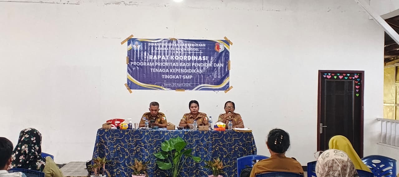Kabardigoel, Boven Digoel – Dalam upaya meningkatkan kualitas pendidikan melalui distribusi tenaga pendidik yang merata, Dinas Pendidikan dan Kebudayaan (Disdikbud) Kabupaten Boven Digoel menggelar rapat koordinasi (rakor) program prioritas pendidikan tingkat Sekolah Menengah Pertama (SMP), Selasa (21/4/2026).