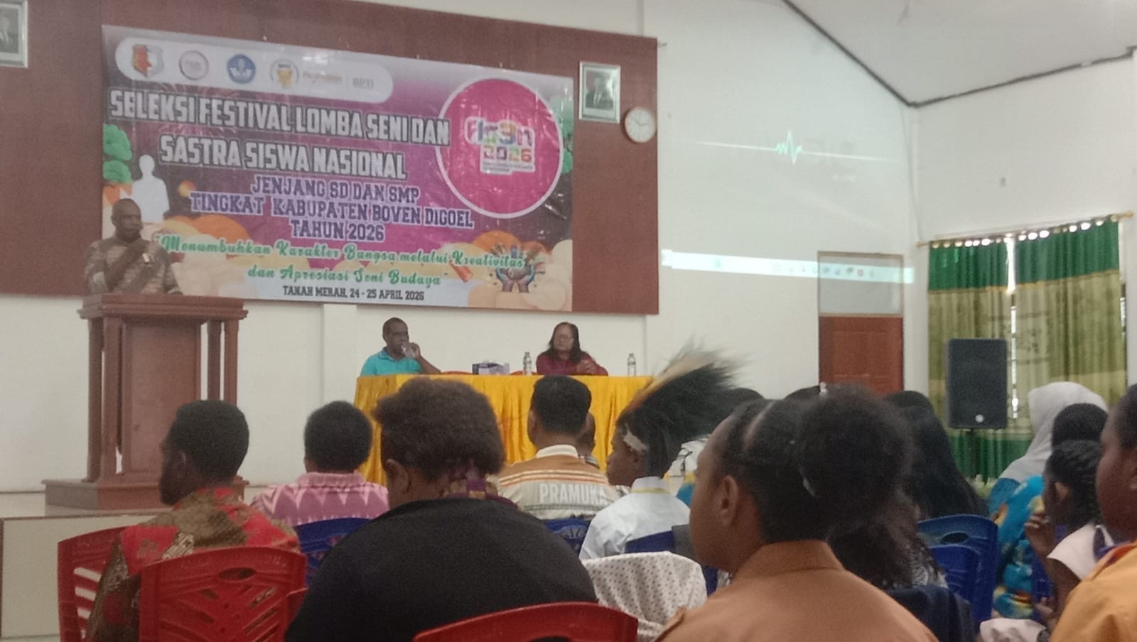Kabardigoel, Boven Digoel – Dinas Pendidikan dan Kebudayaan (Disdikbud) Kabupaten Boven Digoel menggelar seleksi Festival dan Lomba Seni Sastra Siswa Nasional (FLS2N) tingkat Sekolah Dasar (SD) dan Sekolah Menengah Pertama (SMP), Jumat (24/04/2026). Kegiatan ini bertujuan menumbuhkan karakter bangsa melalui kreativitas serta apresiasi seni dan budaya sejak dini.